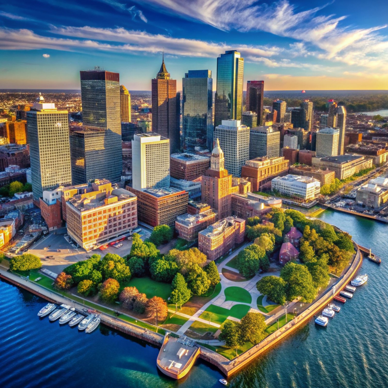 Boston waterfront view with urban city skyline and modern architecture over sea.